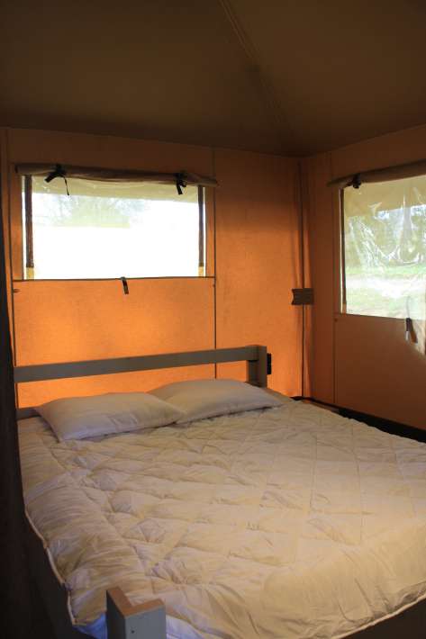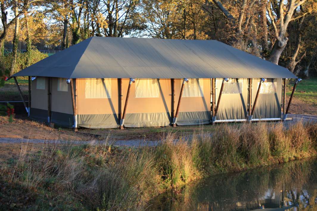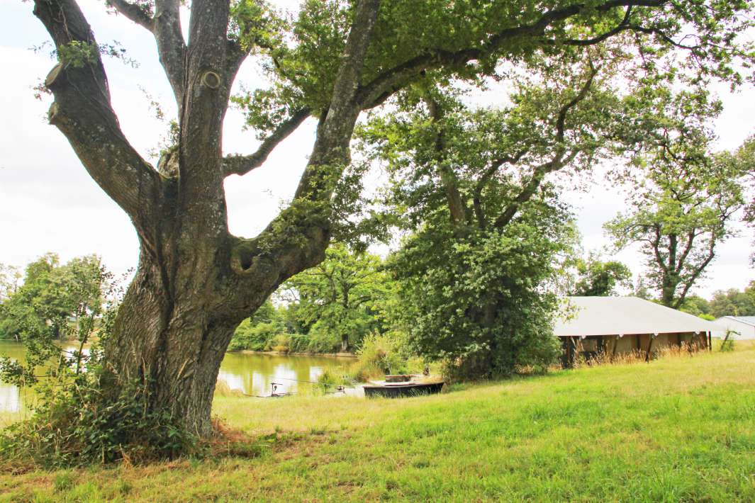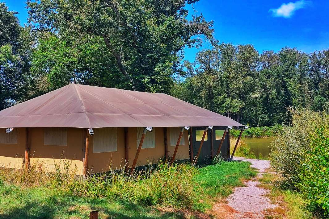 In central western France, in the Deux-Sévres department, towards Poitiers, lies the domain of Les etangs de la Crolee in the beautiful rolling French landscape. The estate is 16 hectares in total and is completely fenced. As you drive through the gate onto the grounds, the holiday feeling immediately welcomes you. The estate contains 2 lakes, namely Crolee Bas (the lower lake) and Crolee Haut (the upper lake). Both lakes are rented exclusively and have their own large luxury safari tent with an impressive 35m2 interior space and a covered veranda of another 20m2. The layout consists of 2 separate bedrooms, a child bed/play area, a large kitchen, and a lounge area. Due to the slight height difference, both lakes disappear from each other’s view. You’ll feel like you have your own private lake with just your family or friends.